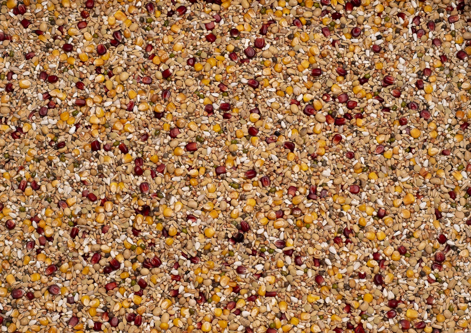 Cribbsmais 15%, Bordeux-Mais 15%, Dari 13%, Sorghum 11%, Hafer geschält 8%, 2 Grassaaten 8%, Weizen 7%, Soja getoastet 6%, Hanfsamen 5%, Kardisaat 5%, Platahirse 4%, Linsen 2%, Sesamen 1%, Raps 1%