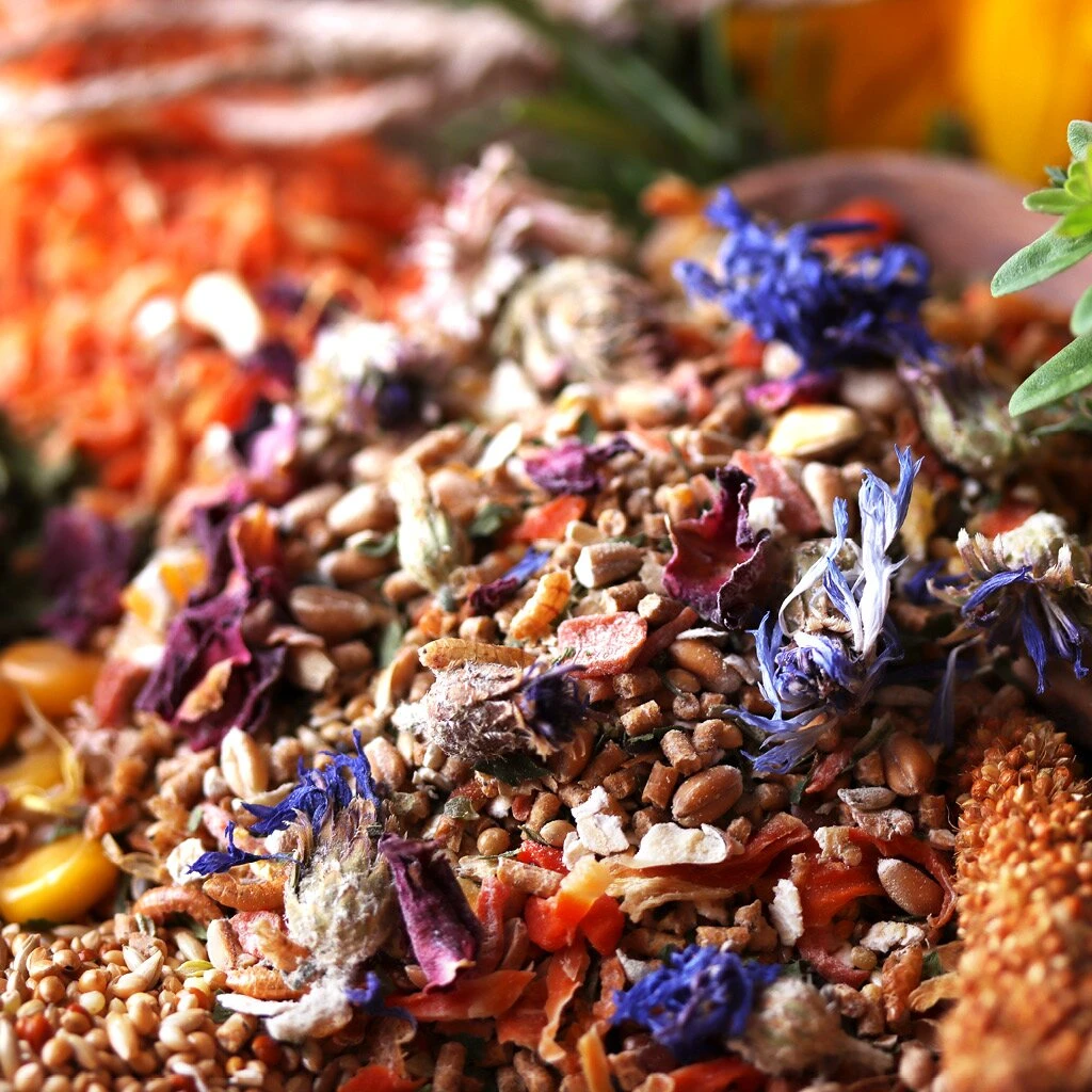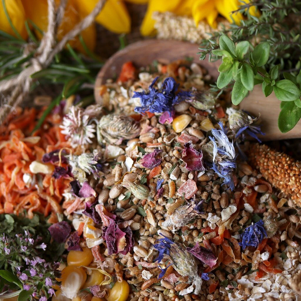 Weizen, Mais, Sojaextraktionsschrotfutter aus geschälter Saat (dampferhitzt, mit Soapstock), Haferflocken, Calciumcarbonat, 3,5% Karottenraspeln*, Petersilienblätter*, Gerste, Weizengrießkleie, Maiskleberfutter, Blaumohn, 1,5% Hirsemischung (Plata Hirse, Senegalhirse, Silberhirse, Rote Mohair Hirse, Kanariensaat, Nigersamen), Mineralgrit (Kohlensaurer Muschelkalk, Kohlensaurer Algenkalk, Quarz, Rotstein, Pflanzliche Kohle), 1,5% Leinsaat (extr.), 1% Gammarus*, Kräuter- und Wiesensamen (Weißklee, Esparsette, Rotklee, Perserklee, Schwedenklee, Hornschotenklee, Wiesenrispe, Lieschgras, Gelbklee, Dt. Weidelgras, Rotschwingel, Kümmel, Kl. Wiesenknopf, Dill, Fenchel, Petersilie, Hornschotenklee, Spitzwegerich, Wegwarte, Wilde Möhre, Schafgarbe, Wundklee), Pfefferminzblätter*, Rosmarinblätter*, Oreganoblätter*, Brennnesselblätter*, 0,5% Blütenmischung* (Ringelblumenblüten, Lavendelblüten, Kornblumenblüten, Rotkleeblüten, Kamillenblüten, Rosenblüten), 0,5% Bierhefe, Sonnenblumenkerne, Monocalciumphosphat, Pflanzenöl (Sonnenblumen-, Raps-, Kokos-, Sheaöl), Sonnenblumenextraktionsschrotfutter (mit Soapstock), Natriumchlorid, Natriumbicarbonat *schonend getrocknet.